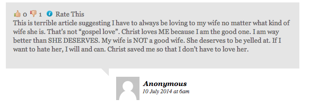The first example may be simply a person trolling to get a reaction; but even as trolling, it has to rank as one of the most highly entitled abuser language I have ever seen on the web. It was a comment made on the Christian Husband’s Marriage Catechism over at the Reformed Baptist Fellowship blog. (link) And it is noteworthy that not one of the catechism-defenders on that thread denounced it or made any remark about it.