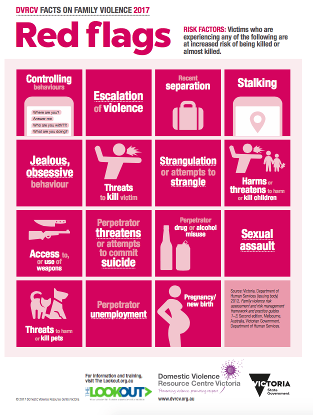 This infographic comes from DVRCV (Domestic Violence Resource Centre Victoria, Australia). It highlights the factors that put family violence victims at increased risk of being killed or seriously injured. These risk factors have been ascertained by research that looked at the backstory of lethal and near-lethal cases of domestic violence.