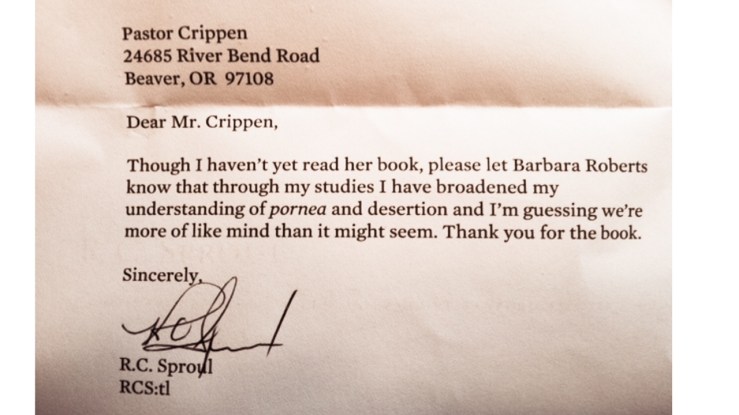 In October 2012, A Cry for Justice mailed R.C. Sproul a copy of Barbara Roberts’ book Not Under Bondage, accompanied by a letter encouraging him to re-think his teaching that domestic abuse was not biblical grounds for divorce. The letter shown in the picture above was received by me (Jeff) from R.C. as thanks for that book and letter.