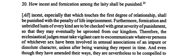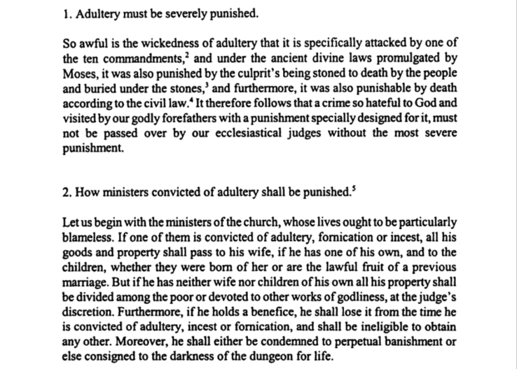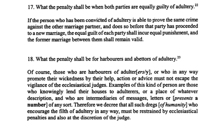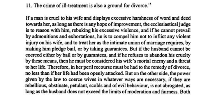 If a man is cruel to his wife and displays excessive harshness of word and deed towards her, as long as there is any hope of improvement, the ecclesiastical judge is to reason with him, rebuking his excessive violence, and if he cannot prevail by admonitions and exhortations, he is to compel him not to inflict any violent injury on his wife, and to treat her as the intimate union of marriage requires, by making him pledge bail, or by taking guarantees. But if the husband cannot be coerced either by bail or by guarantees, and if he refuses to abandon his cruelty by these means, then he must be considered his wife’s mortal enemy and a threat to her life. Therefore in her peril recourse must be made to the remedy of divorce, no less than if her life had been openly attacked. But on the other side, the power given by the law to coerce wives, by whatever ways are necessary, if they are rebellious, obstinate, petulant, scolds and of evil behaviour, is not abrogated, as long as the husband does not exceed the limits of moderation and fairness. Both in this and in the above-mentioned offences, it is our will that parties set free in this way may contract a new marriage (if they wish), while those convicted of the said crimes shall be punished either by perpetual exile or by imprisonment for life.