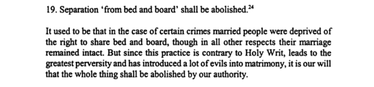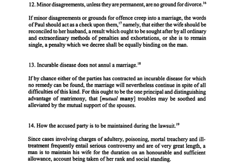 If minor disagreements or grounds for offence creep into a marriage, the words of Paul should act as a check upon them (1 Cor 7:11) namely, that either the wife should be reconciled to her husband, a result which ought to be sought after by all ordinary and extraordinary methods of penalties and exhortations, or she is to remain single, a penalty which we decree shall be equally binding on the man.