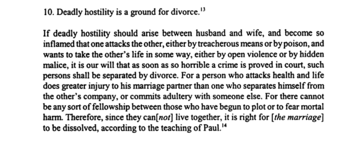 If deadly hostility should arise between husband and wife, and become so inflamed that one attacks the other, either by treacherous means or by poison, and wants to take the other’s life in some way, either by open violence or by hidden malice, it is our will that as soon as so horrible a crime is proved in court, such persons shall be separated by divorce. For a person who attacks health and life does greater injury to his marriage partner than one who separates himself from the other’s company, or commits adultery with someone else. For there cannot be any sort of fellowship between those who have begun to plot or to fear mortal harm. Therefore, since they can[not] live together, it is right for [the marriage] to be dissolved, according to the teaching of Paul.
