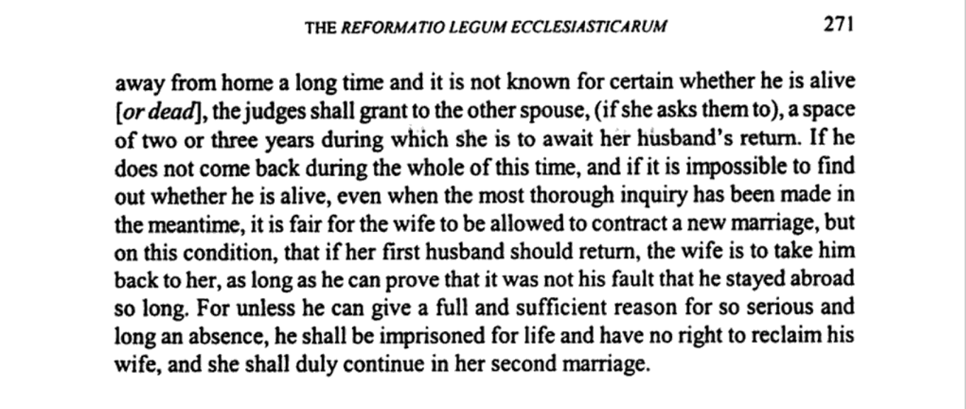 Just because Cranmer drafted laws for responding to domestic abuse, does not mean he approved of the English law which allowed a husband to beat his wife so long as he did not use a stick thicker than his thumb (that’s where the expression ‘rule of thumb’ comes from). [May 13, 2022: While commonly believed, this explanation for “rule of thumb” is incorrect. We added links to the bottom of Barb’s comment for anyone who might be interested in a more detailed explanation of the expression “rule of thumb”. Editors.] Is it very likely that Cranmer wanted that law to be changed. But so far as I know that law was part of ‘common law’ in England, it did not come from canon law (ecclesiastical law). And Cranmer was drafting a reform of canon law (ecclesiastical law). He had no power to reform common law. He was the Archbishop of Canterbury so he did not have a lot of power over common law in England, that was the realm of the King and Parliament.