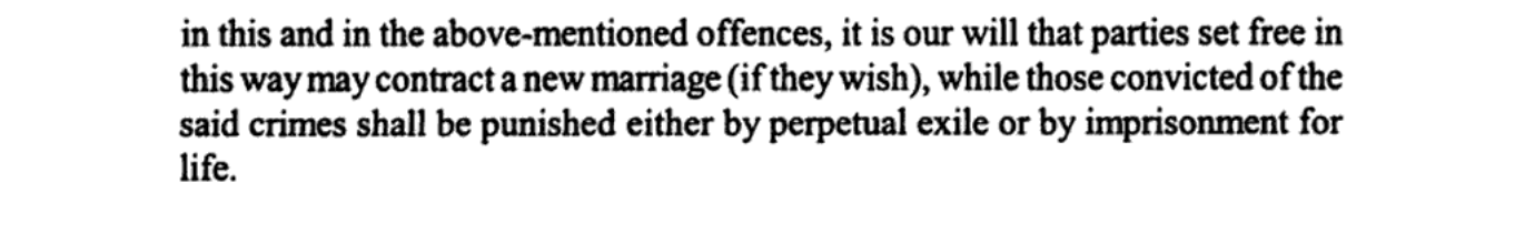 If a man is cruel to his wife and displays excessive harshness of word and deed towards her, as long as there is any hope of improvement, the ecclesiastical judge is to reason with him, rebuking his excessive violence, and if he cannot prevail by admonitions and exhortations, he is to compel him not to inflict any violent injury on his wife, and to treat her as the intimate union of marriage requires, by making him pledge bail, or by taking guarantees. But if the husband cannot be coerced either by bail or by guarantees, and if he refuses to abandon his cruelty by these means, then he must be considered his wife’s mortal enemy and a threat to her life. Therefore in her peril recourse must be made to the remedy of divorce, no less than if her life had been openly attacked. But on the other side, the power given by the law to coerce wives, by whatever ways are necessary, if they are rebellious, obstinate, petulant, scolds and of evil behaviour, is not abrogated, as long as the husband does not exceed the limits of moderation and fairness. Both in this and in the above-mentioned offences, it is our will that parties set free in this way may contract a new marriage (if they wish), while those convicted of the said crimes shall be punished either by perpetual exile or by imprisonment for life.