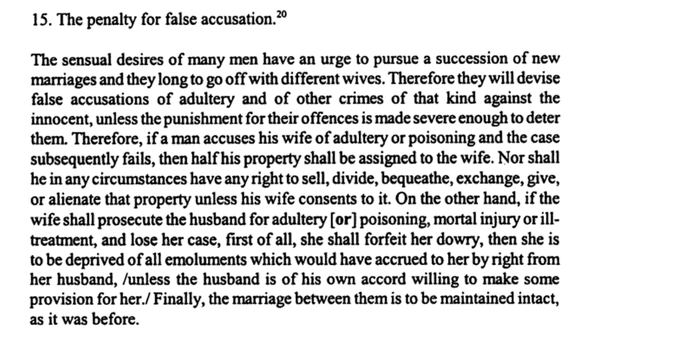 If deadly hostility should arise between husband and wife, and become so inflamed that one attacks the other, either by treacherous means or by poison, and wants to take the other’s life in some way, either by open violence or by hidden malice, it is our will that as soon as so horrible a crime is proved in court, such persons shall be separated by divorce. For a person who attacks health and life does greater injury to his marriage partner than one who separates himself from the other’s company, or commits adultery with someone else. For there cannot be any sort of fellowship between those who have begun to plot or to fear mortal harm. Therefore, since they can[not] live together, it is right for [the marriage] to be dissolved, according to the teaching of Paul.