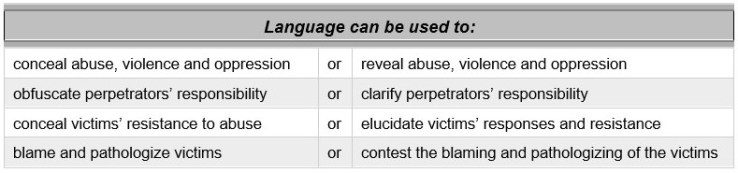 ¹ I created the graphic about language from the work of Allan Wade and Linda Coates, especially their article Language and Violence: Analysis of Four Discursive Operations – link takes you to a pdf of that article which was originally published in the Journal of Family Violence (2007) 22:511-522.