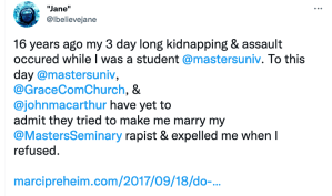 Do you see me? — A survivor, “Jane Doe”, recounts how she was abominably treated by The Master’s College (now called The Master’s University) and Grace Community Church leaders when she reported that she had been raped. Sept 18, 2017.