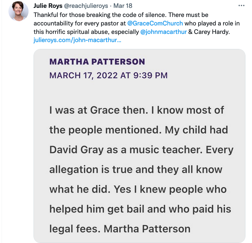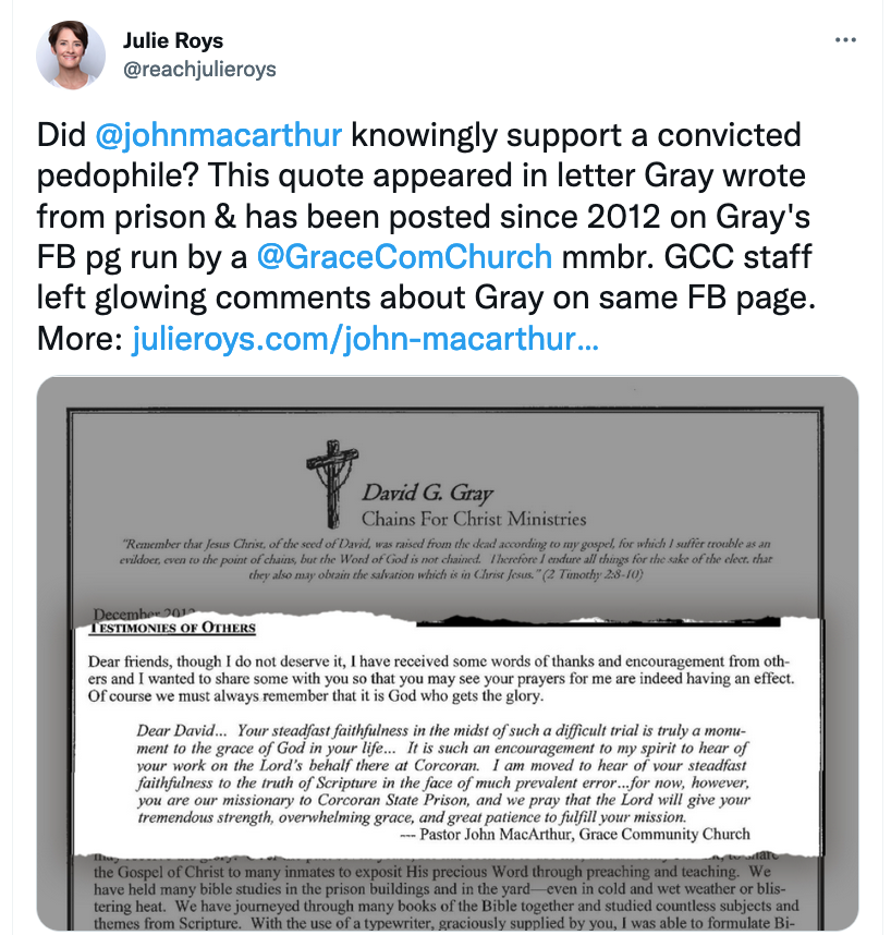 Julie Roys has another The Roys Report article (published later than Barb’s original post) on John MacArthur, and David and Eileen Gray, etc. that fits the playbook. The article is titled MacArthur Church Elder: We’re Keeping ‘Exculpatory’ Evidence ‘Confidential’. (MacArthur Church Elder: We’re Keeping ‘Exculpatory’ Evidence ‘Confidential’ [Internet Archive link])