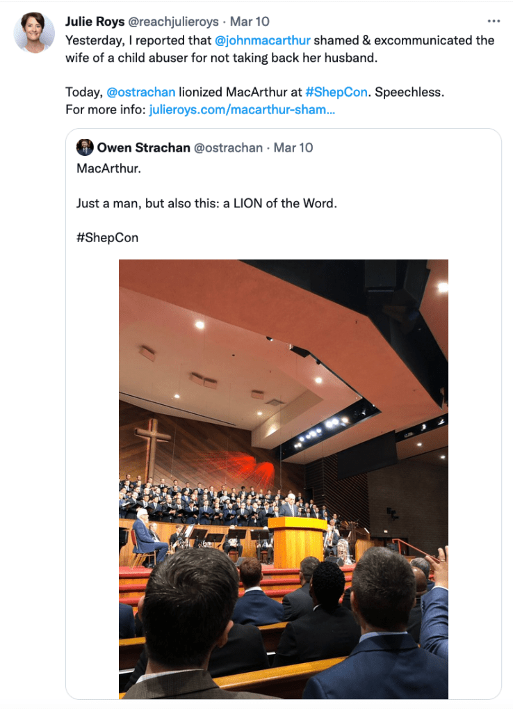 I started to write a comment in response to what I bolded above (in what I quoted from the original post), using excerpts from two of the (The Roys Report) linked articles in the original post, John MacArthur Shamed, Excommunicated Mother for Refusing to Take Back Child Abuser and John MacArthur’s Church Supported Convicted Child Abuser & Pedophile, Records Show.