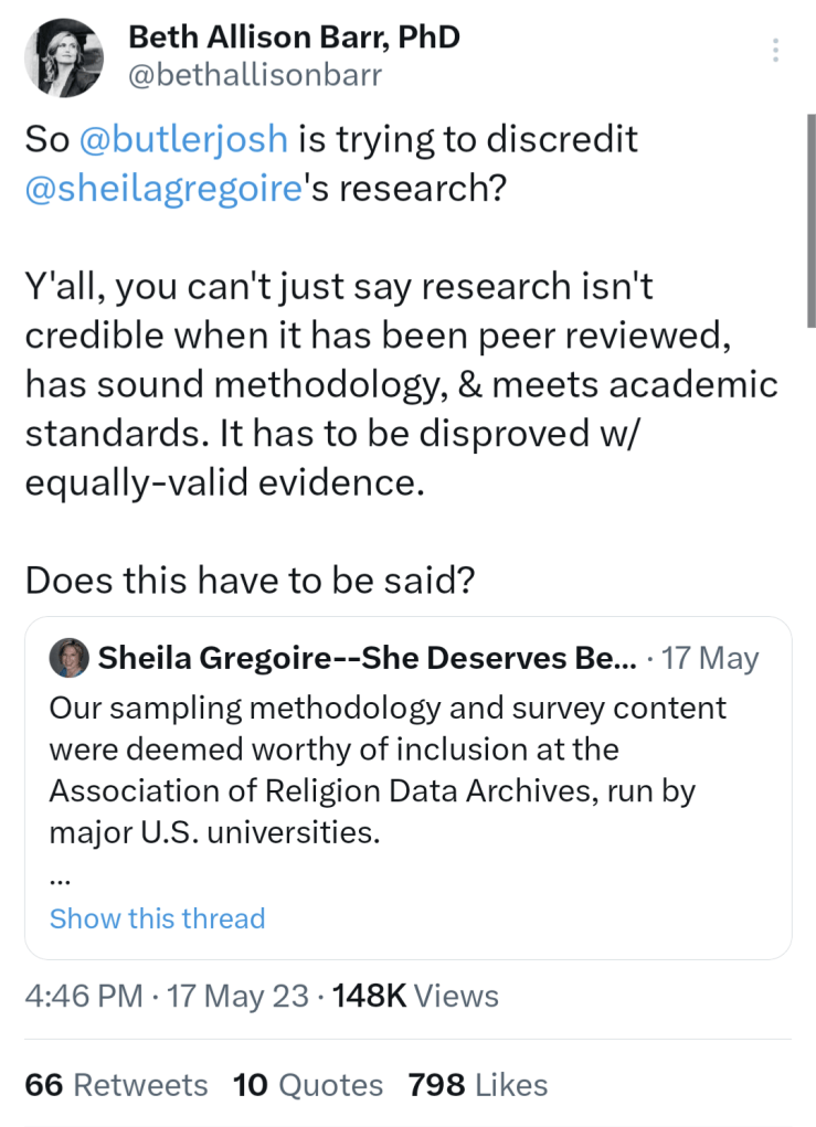 Sheila then shared a tweet from Dr. Beth Allison Barr, where Dr. Barr says Patrick and Josh can’t challenge Sheila’s research because it’s been peer reviewed:
