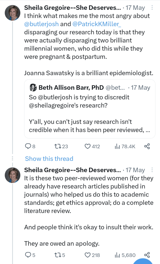 Sheila’s comment about [paraphrasing] “two millennial women doing this research while pregnant and postpartum” [is] strange. And? This gives them more credibility because….?