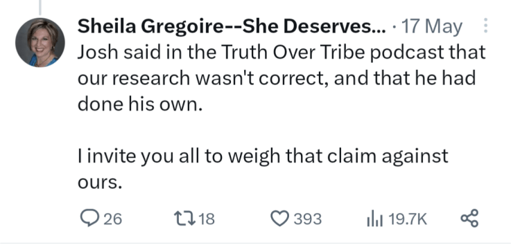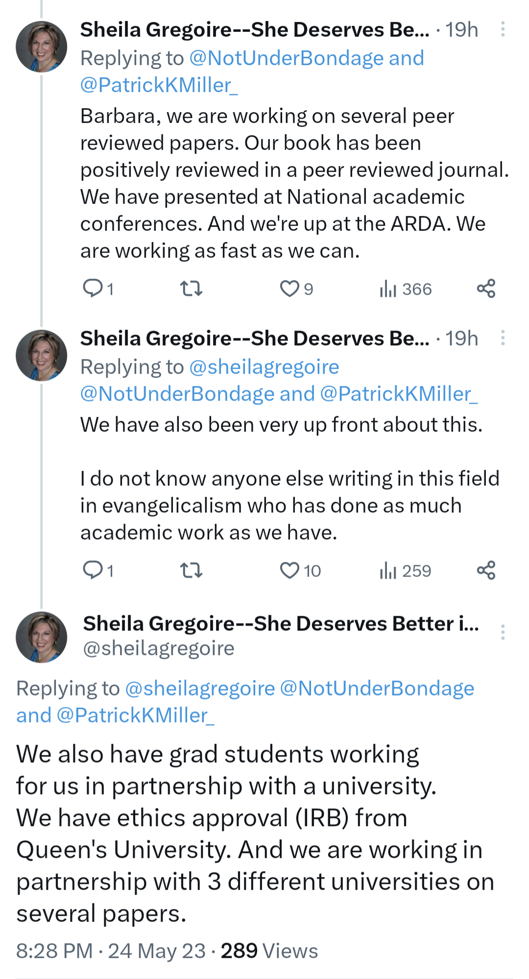 Sheila then shared a tweet from Dr. Beth Allison Barr, where Dr. Barr says Patrick and Josh can’t challenge Sheila’s research because it’s been peer reviewed: