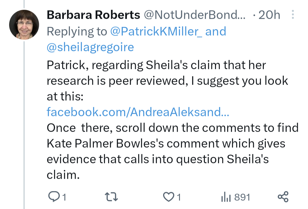 [UPDATE by Barbara Roberts, 8 June: Dr Barr has now deleted the tweet shown in the screen shot below. Barbara Roberts challenged Dr Barr’s erroneous statement that Sheila’s research has been peer reviewed. That led to a twitter war that lasted days. Eventually, Dr Barr deleted her erroneous tweet.]