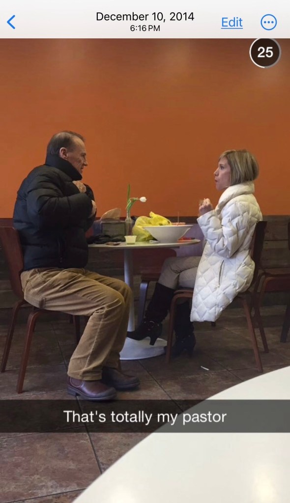 Here is a photo of Liam Goligher and Susan Elzey in a cafe in Haddonfield, a few months after they were ticketed for engaging in sexual activity in a public park and having paid their fines. The photo was shared with a few people on Snapchat in December, 2014. The person who took the photo was not attending Tenth Presbyterian often, and thought the woman in the photo was Goligher’s daughter (and commented to others how cool it was that he took his daughter out to coffee!). Hence the caption over the photo “That’s totally my pastor!