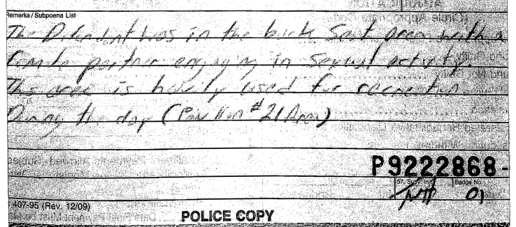 Here are screen shots of the parts of the tickets which say the defendants were engaging in sexual activity in the back seat area of Pavilion 21 which is heavily used for recreation during the day.